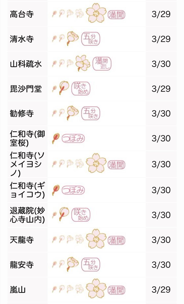 截至 2026-03-31,京都仁和寺的櫻花目前花苞中。開花指數為 16/100(較昨日 -10)。